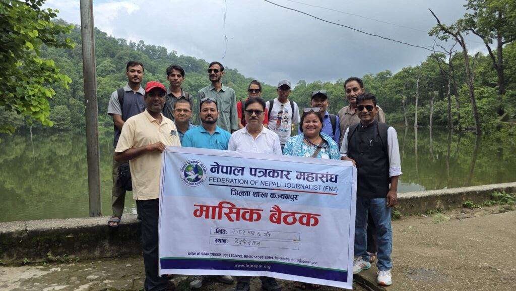 महेन्द्रनगर–नेपाल पत्रकार महासंघ कञ्चनपुर शाखाको मासिक घुम्ती बैठक कञ्चनपुर जिल्लाको धार्मिक पर्यटकिय स्थल बेदकोट ताल परिसरमा बसेको छ । शुक्रबार जिल्लाको बेदकोट नगरपालिका वडा नं। ३ स्थीत बेदकोट ताल परिसरमा महासंघको ९औ बैठक सम्पन्न भएको हो । पत्रकार महासंघका अध्यक्ष सुरेश सिंह धामीको अध्यक्षतामा उपाध्यक्ष धर्मारोकाया, सचिव कुन्दन पाण्डेय, कोषाध्यक्ष मोहन विष्ट र सहसचिव गोकुल जोशीको उपस्थीति रहेको थियो । सदस्यहरुमा केशव भट्ट, दिनेश ओझा, विकास सिंह महता, माधव पौडेल, ऐश्वर्या कुवर, धन बहादुर विकको उपस्थीती रहेको थियो । पत्रकार महासंघका सल्लाहकार माधव धामीको बिशेष उपस्थिति रहेको थियो । बैठकले विभिन्न निर्णय सर्वसम्मतरुपमा पारित गरको छ । बैठकले निम्नलिखित महत्वपूर्ण निर्णय पारित गरेको पत्रकार महासंघ कञ्चनपुर शाखाका सचिव कुन्दन पाण्डेयले बताए ।