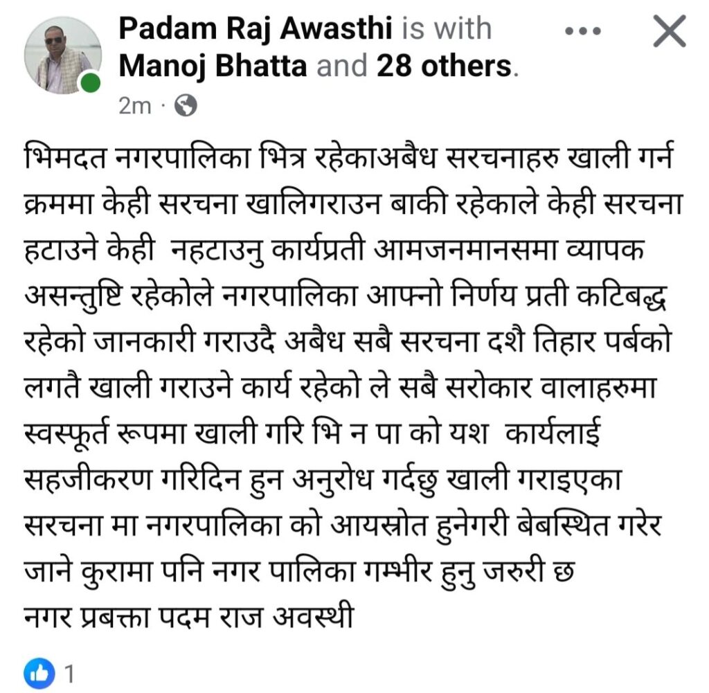 दशैं तिहारपछि अवैध संरचना खाली गर्ने कार्य सुरु हुने नगर प्रवक्ता अवस्थीले सामाजिक सञ्जालबाट सार्वजनिक गरेका छन् । भीमदत्त नगर विकास समितिको जग्गा अवैध अतिक्रमण गरी निर्माण गरिएका संरचना हटाउने कार्य रोकिएको एक वर्ष बढी पुगेको छ । भीमदत्तले होटेल ओपेरा पछाडिमा संरचना हटाउन सुुरु गरी दुई वर्ष अघि अतिक्रमण खाली गर्ने अभियान सुरु गरेको थियो । अवैध संरचना निर्माण गरेकालाई दशैतिहार पर्खिने जानकारी दिएका छन् ।
