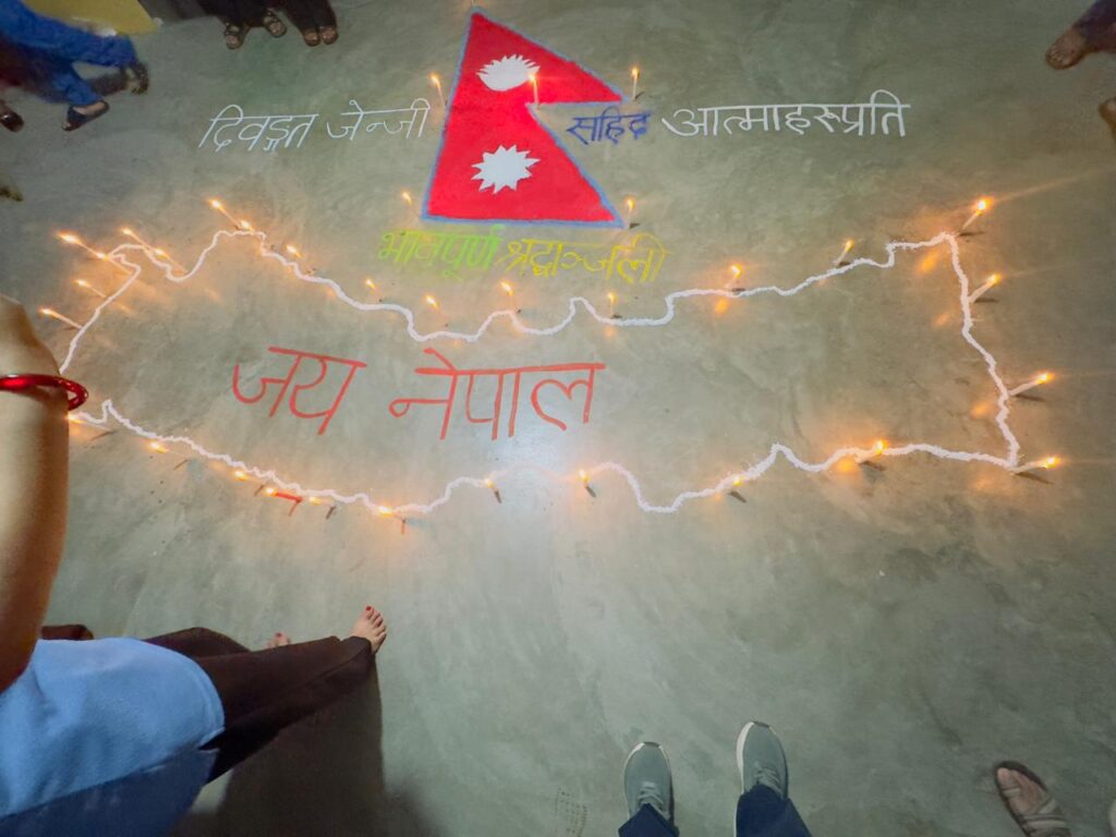 महेन्द्रनगर – गत भाद्र २३ र २४ गते भएको जेनजी आन्दोलनको क्रममा शहिद भएका सहिदहरुप्रति मेधावी सेकेण्डरी स्कूलका विद्यार्थीहरुले हार्दिक श्रद्धाञ्जली अर्पण गरेका छन् । बुधबार बेलुका मेधावी सेकेण्डरी विद्यालयले शिक्षक शिवम बस्नेतको संयोजकत्वमा श्रद्धाञ्जली सभाको आयोजना गरी विद्यालयका विद्यालय, शिक्षक, कर्मचारी लगायतले आन्दोलनमा सहादत भएका शहिदहरुप्रति उच्च सम्मानका साथ हार्दिक श्रद्धाञ्जली दिएका हुन् । श्रद्धाञ्जली सभामा विद्यार्थीहरुले नेपालको नक्सा बनाई मौनबत्ति बालेर शहिदहरुको मृत्य आत्माको चिरशान्तिको कामना सहित परिवारजनमा संवेदना प्रकट गरेको श्रद्धाञ्जली सभाका संयोजक शिक्षक शिवम बस्नेतले बताए । श्रद्धाञ्जली सभामा विद्यालयका प्रिन्सिपल महाशर्मा न्यौपानेलगायत शिक्षक ईन्दु भट्ट, अन्य शिक्षक, विद्यालय कर्मचारी, कक्षा ९ र १० का विद्यार्थीहरुको उपस्थिति रहेको संयोजक बस्नेतले बताए । शिक्षक बस्नेतका अनुसार अनौपचारीक रुपमा गरीएको उक्त श्रद्धाञ्जली सभामा एक मिनट मौनधारणा गरीनुका साथै पालैपालो प्रमुख व्यक्तित्वहरुले शहिदहरुप्रति श्रद्धासुमन प्रकट गरीएको छ । नेपालको नक्सा बनाई सिमानामा मौनवत्ति बालिएको थियो भने नक्साको माथि नेपालको झण्डा बनाईएको थियो ।