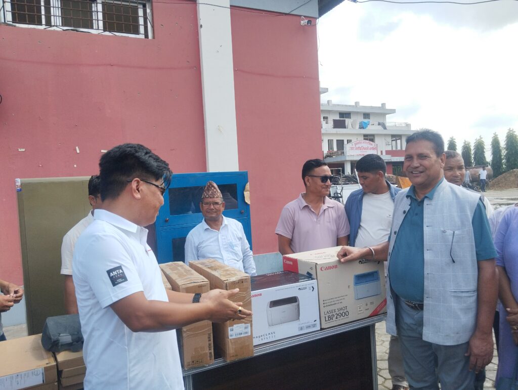 पालिकालाई पुनर्निर्माण र सञ्चालनमा सहयोग पुर्याउने उद्देश्यले पूर्नवासका युवा व्यवसायी दाबत तामाङ ले पालिकालाई अति आवश्यक महत्वपूर्ण सामग्री हस्तान्तरण गर्नुभएको छ। उहाँले पालिकालाई चार ४ थान कम्प्युटर दुई २थान दराज दुई २थान टेबल दुई २थान प्रिन्टर सहितका सामग्रीहरू नगरपालिकाका नगरप्रमुख ताेयराज शर्मा लाई हस्तान्तरण गर्नुभएको छ र उक्त कार्यक्रममा नगरपालिकाका उपप्रमुख सहित कार्यालय प्रमुख को समेत उपस्थिति रहेको थियो।